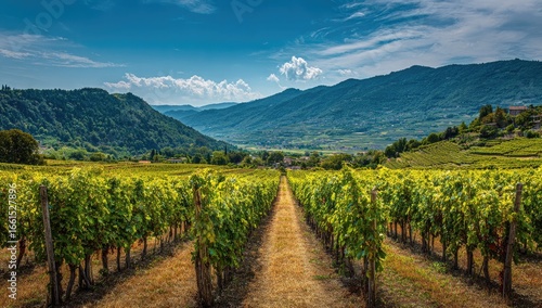 © hutan, Obraz premium Sunny vineyard rows stretch towards distant mountains
