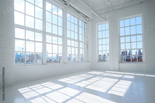 © Tunsale, Fototapeta premium Sunny white loft interior with big windows. AI generated illustration.