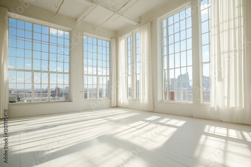 © Tunsale, Fototapeta premium Sunny white loft interior with big windows. AI generated illustration.