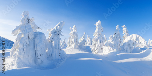 © Ivan Kmit, Fototapeta premium Sunny winter mountain landscape with frozen trees in deep snow. Bright snowy panorama in clear alpine weather