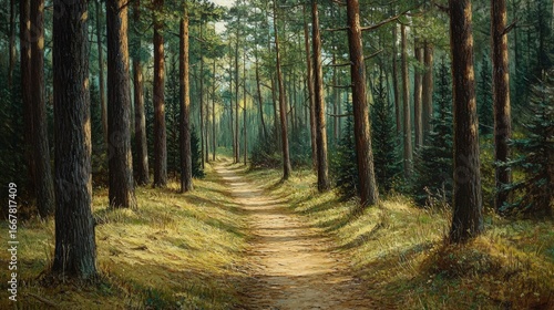 © Sobah, Obraz premium Sunny woodland path through tall trees.