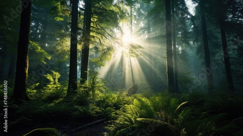 Obraz premium Sunrays in dark forest. Sun rays in woods. Sunbeam light