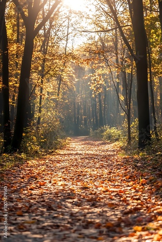 Obraz premium Sunrays shining through trees on a path in the forest, autumn leaves on ground
