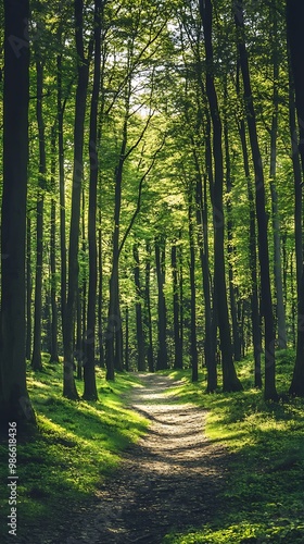 © atar, Fototapeta premium Sunrays through green trees in a forest. Nature background with sunlight, path and green foliage
