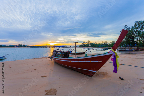 © Narong Niemhom, Naklejka premium sunrise above Sarasin bridge fishing boats are parking on the beach