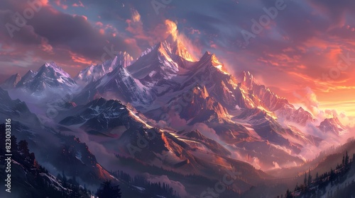 © kiattisak, Obraz premium Sunrise and Sunset in Snowy Mountain Landscape