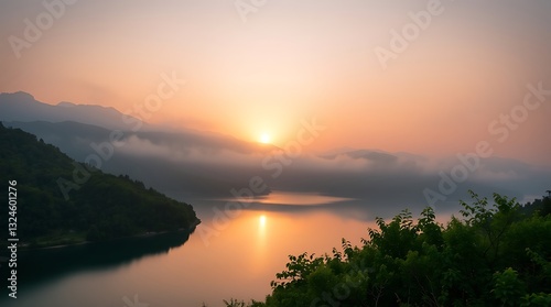 © Pongsatorn, Fototapeta premium Sunrise and sunset over the lake and river with beautiful sky and water reflections