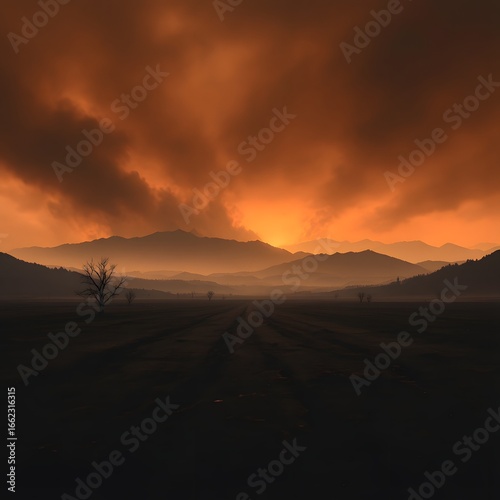 © Maikia Desings, Obraz premium Sunrise and sunset paint the vast desert sky with vibrant red, orange, and yellow hues over the tranquil landscape of mountains and sand