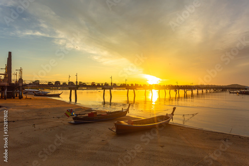 © Narong Niemhom, Obraz premium sunrise at Chalong pier. Chalong bay is the most important marina of Phuket there have 2 piers and customs at pier..