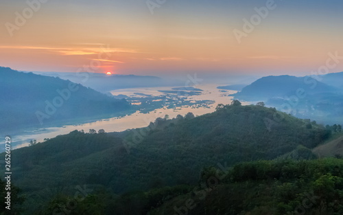 © Yuttana Joe, Obraz premium sunrise at Phu Huay Esan View Point, view of the hill around with sea of mist above Mekong river with soft red sun light in the sky background, Ban Muang, Sang Khom District, Nong Khai, Thailand.