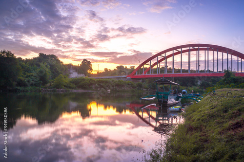 Naklejka premium Sunrise at Samota Bridge in Sumbawa City, Indonesia. There is a traditional wooden boat too under the bridge