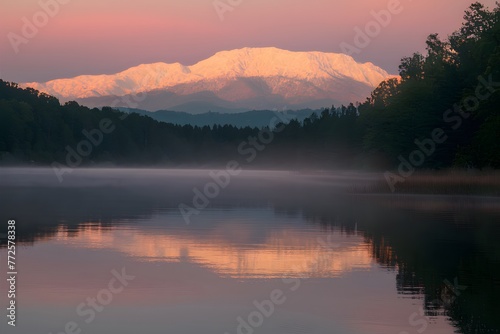 © Jawed Gfx, Fototapeta premium Sunrise bathes the tranquil lake in warm, golden light