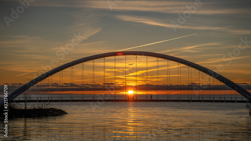 © Lance, Naklejka premium sunrise behind bridge with plane