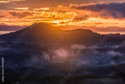 © NuttKomo, Fototapeta premium sunrise behind mountain and fog