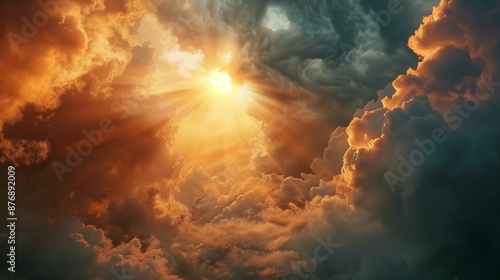 © paco, Fototapeta premium Sunrise Breaking Through Dark Clouds. A stunning image capturing the moment when the sun breaks through dark, stormy clouds, casting a warm golden light across the sky.