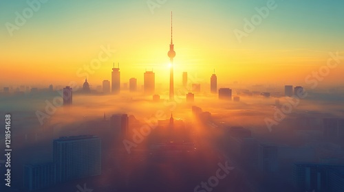 © Юлия Гриб, Fototapeta premium Sunrise Casts a Golden Glow Over a City Skyline Shrouded in Morning Mist With Towering Buildings and a Prominent Observation Tower in View