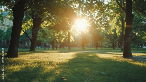 Naklejka premium Sunrise casts golden light through trees in a serene park setting during...