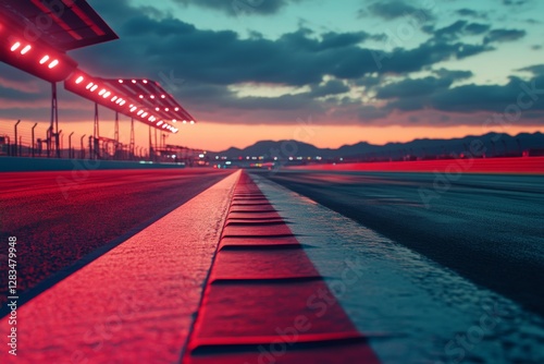 Fototapeta premium Sunrise casts vibrant colors over empty racetrack with dynamic lighting in...