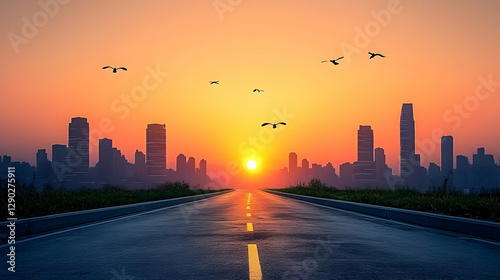 © muhammad gunawan, Naklejka premium Sunrise city road birds
