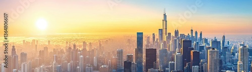 Fototapeta premium Sunrise cityscape, aerial view, hazy morning, urban skyline, city background