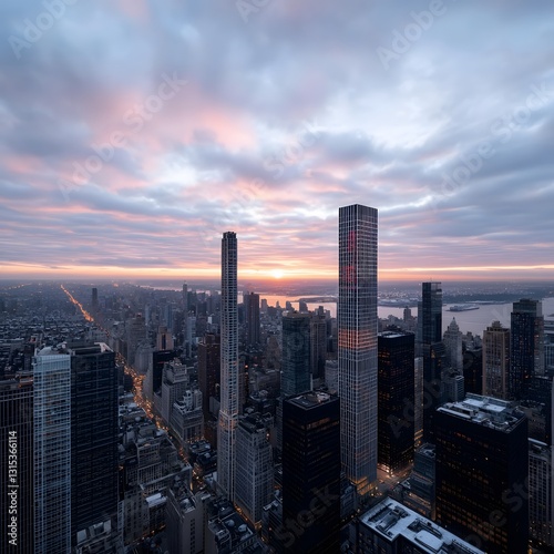 Fototapeta premium Sunrise cityscape, Manhattan, aerial view, winter