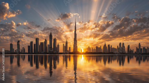 Naklejka premium Sunrise cityscape of Dubai skyline with reflections
