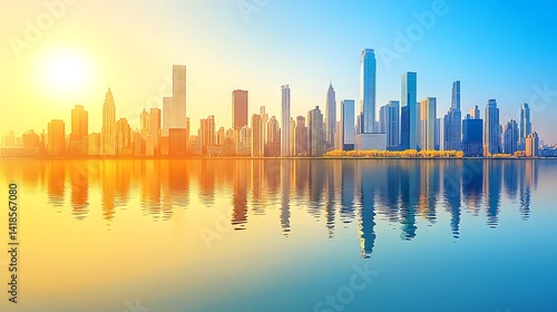 © Diki prayoga, Fototapeta premium Sunrise cityscape reflecting on calm water.