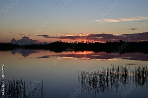 Fototapeta premium Sunrise cloudscape reflected in tranquil water of Nine Mile Pond in Everglades National Park, Florida.