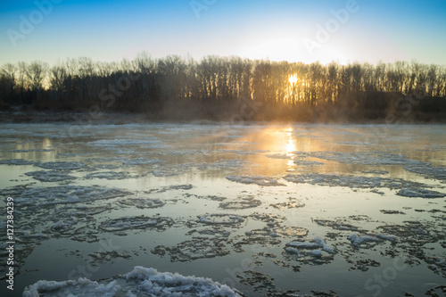 © alekseynikiforov, Fototapeta premium Sunrise during freeze-up in the river