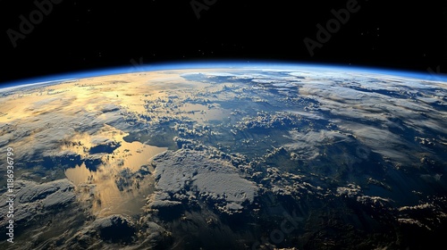 Obraz premium Sunrise Earth view from space, clouds, landmasses. Global environmental backdrop.