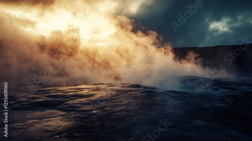 © AlfaSmart, Obraz premium Sunrise Geothermal Landscape: A Dramatic View of Earth's Power