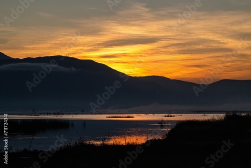 Obraz premium Sunrise golden hour over a lake with reflections and hills