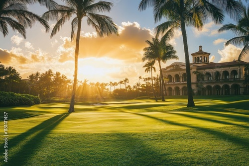 © mochalfin, Obraz premium Sunrise golf course resort palm trees Hawaii