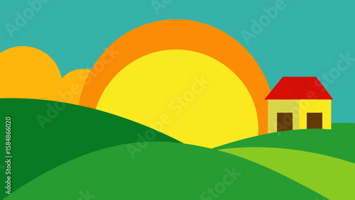 © Sharati, Fototapeta premium sunrise green hills red roof house