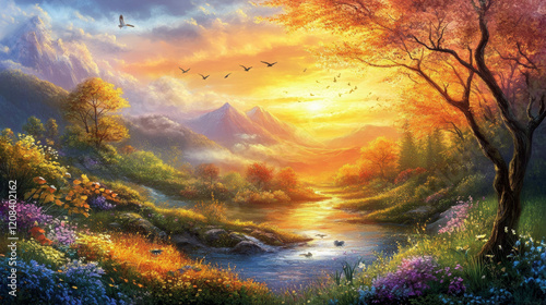 © Fatim, Obraz premium Sunrise: Hope and New Beginnings: The sunrise in the background symbolizes the dawn of a new season, bringing warmth, light, and a sense of optimism.