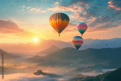 Naklejka premium Sunrise Hot Air Balloons Soaring Over Misty Mountains