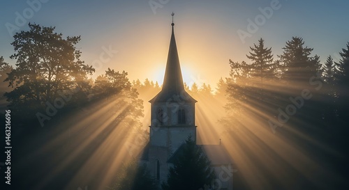 © Agung, Obraz premium Sunrise Illuminates a Country Church Steeple