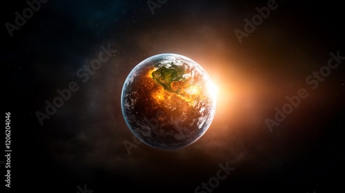 Naklejka premium Sunrise illuminates Earth glowing warmly against dark space. AI Generated