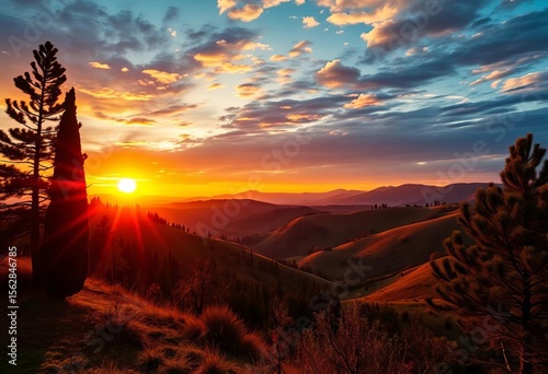 Naklejka premium Sunrise illuminates rolling Italian hills, cypress and pine trees silhouetted against a vibrant sky, scenic, picturesque