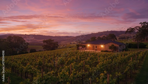Naklejka premium Sunrise illuminating a vineyard, showcasing the beauty of the landscape,...