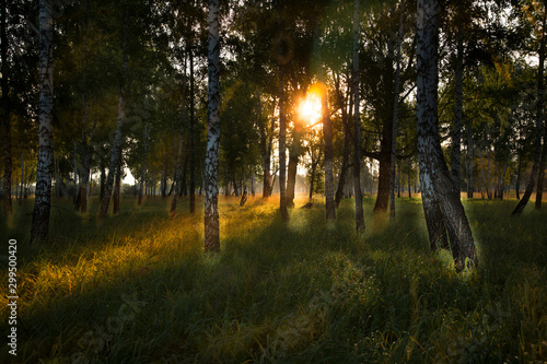 © ads861, Fototapeta premium Sunrise in a birch grove in early September