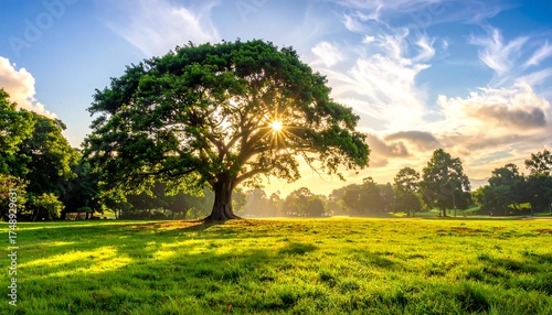 © Rafar, Obraz premium Sunrise in a Lush Green Field with a Majestic Tree.