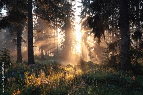Obraz premium Sunrise in a misty forest