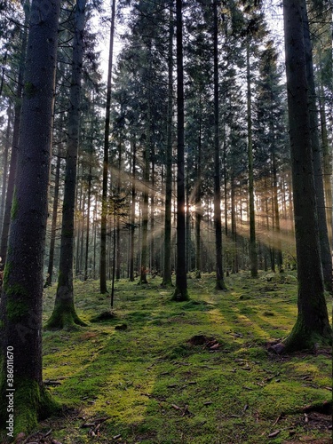 Obraz premium Sunrise in a misty forest