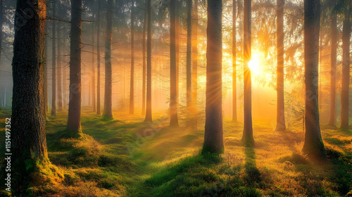 Naklejka premium Sunrise in a Misty Forest: A Peaceful Landscape