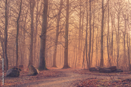 © Polarpx, Naklejka premium Sunrise in a misty forest with big rocks