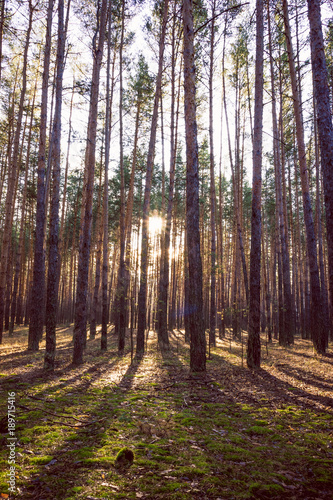 © BearOK, Fototapeta premium Sunrise in a pine forest in the autumn