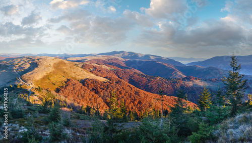 Fototapeta premium Sunrise in autumn Carpathian. Mountain top daybreak landscape with colorful...