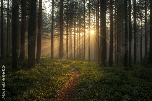 Obraz premium Sunrise in Misty Forest with Sun Rays Through Trees