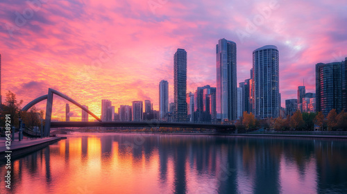 © Ruhi, Naklejka premium Sunrise in modern city, urban skyline with sun rising above skyscraper buildings, view from bridge. Morning metropolis cityscape with road and houses, town architecture, Cartoon vector illustration